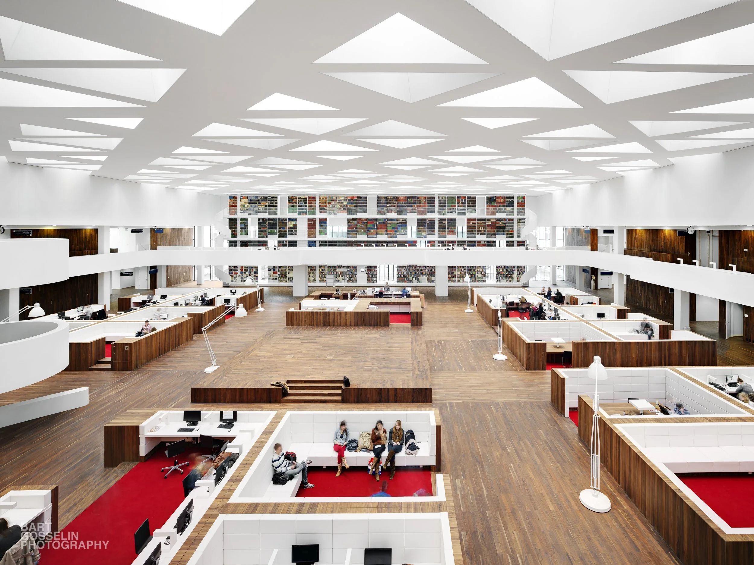 The Education Center is the heart of Rotterdam’s renewed academic hospital Erasmus MC, designed in the 1960s by Arie Hagoort (OD205) in collaboration with Jean Prouvé. The education center is designed as a library landscape where students from all medical disciplines come together. The main space is the education square with a 35-meter long and four-storey-high bookcase wall and a pattern of study islands.